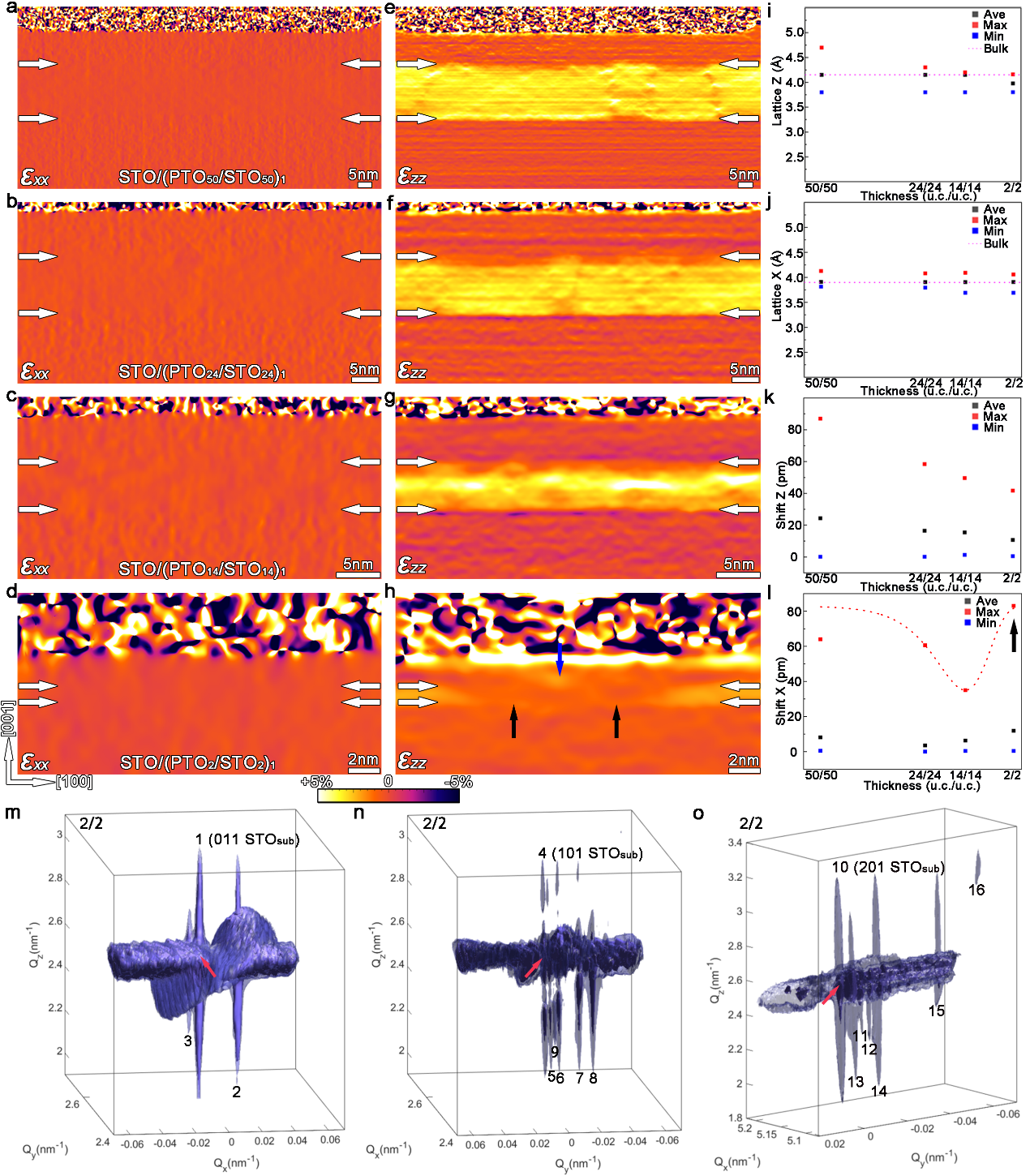 在此,我们通过研究[(PbTiO3)n/(SrTiO3)n]1双层膜中斯格明子-泡泡随厚度的演化(图1),观察到在厚度为2个单胞的超薄双层膜中纯奈尔型斯格明子的原子形态,其拓扑荷为