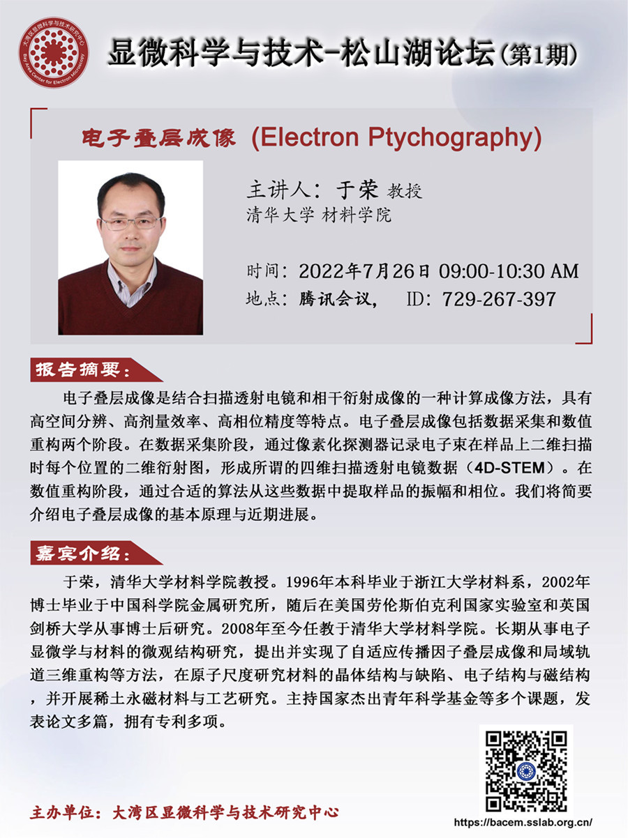 由松山湖材料实验室大湾区显微科学与技术研究中心主办的“显微科学与技术-松山湖论坛”第1期将于2022年7月26日上午09:00-10:30在线上举行,本期论坛由清华大学材料学院教授于荣老师主讲,欢迎感兴趣的老师、同学积极踊跃参加。