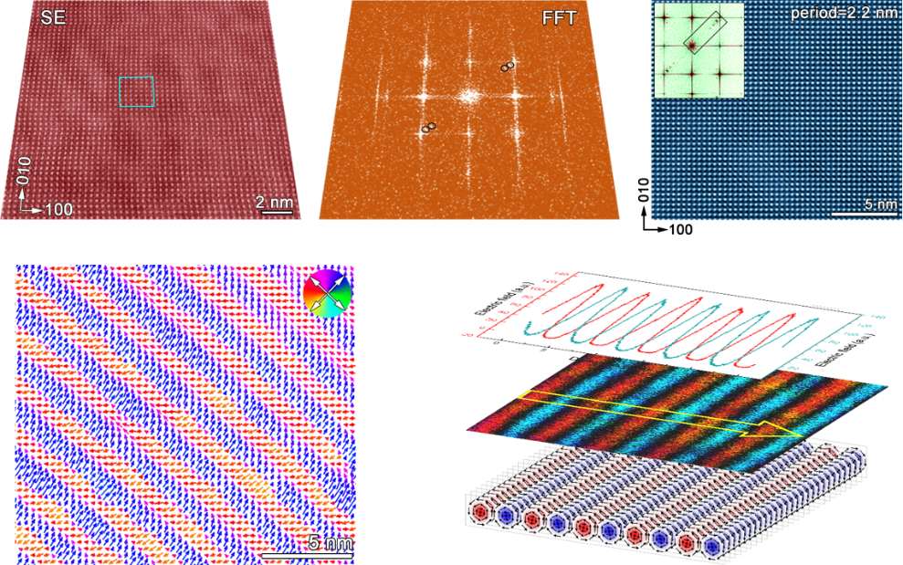 铁电拓扑结构在非易失性和超高密度信息存储等方面具有重要的应用价值。然而,高密度的存储应用必然依赖于大范围铁电拓扑畴的有序化分布。近期,松山湖材料实验室大湾区显微科学与技术研究中心马秀良研究团队发现极性斯格明子超晶体,并在实验上证实多波矢相互耦合进而稳定极性斯格明子超晶体的物理模型。2025年1月16日,相关研究结果以“Dipolar wavevector interference induces a polar skyrmion lattice in strained BiFeO3 films”为题,在线发表在《自然-纳米科技》(Nature Nanotechnology)期刊上。