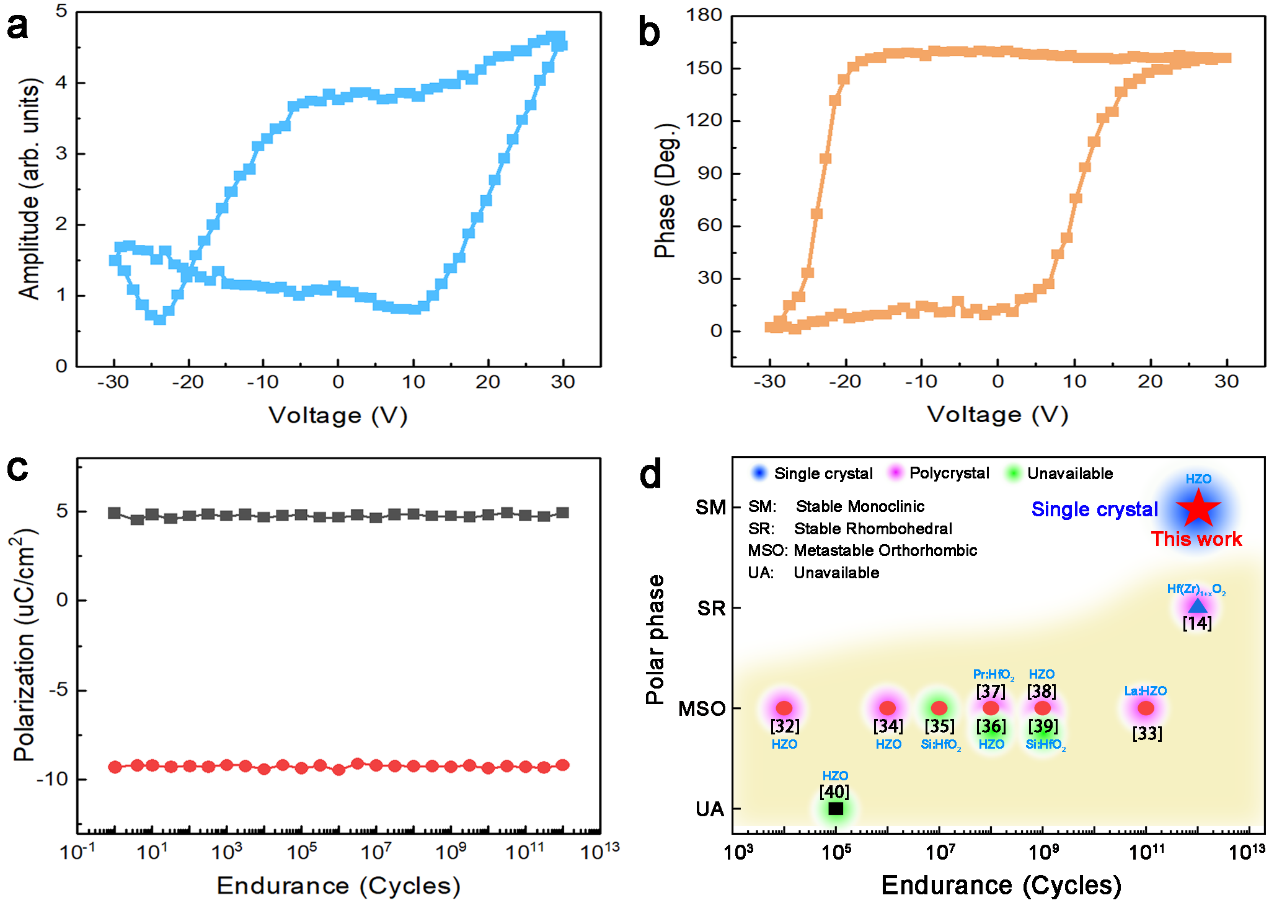 图2 单斜Hf0.5Zr0.5O2薄膜的铁电性及其优异的耐疲劳性能