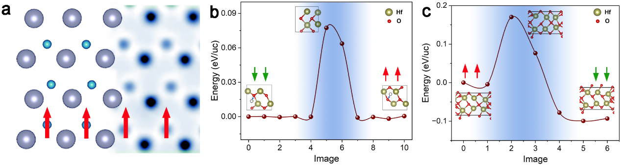 图5 第一性原理计算表明新型极性单斜相的铁电翻转势垒远低于亚稳铁电正交相的翻转势垒